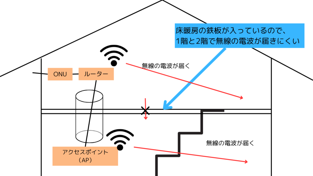 「家の中で無線LANが届かない」ということがないようにするための対策は、各フロアにアクセスポイントを設置し、ルーターと有線でつなぐことが最も効果的です。